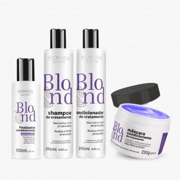 Kit Capilar De Tratamento Blond ( Sampoo 295ml 5039/ Condicionador 295ml 5041/ Mascara 250g 5236/ Finalizador de 100ml 5348) Neutraliza tons amarelados e realça tons prateados.