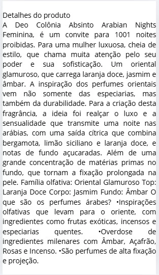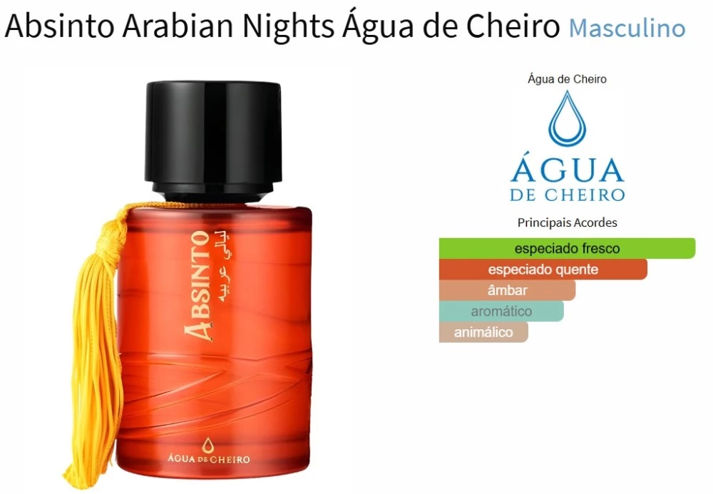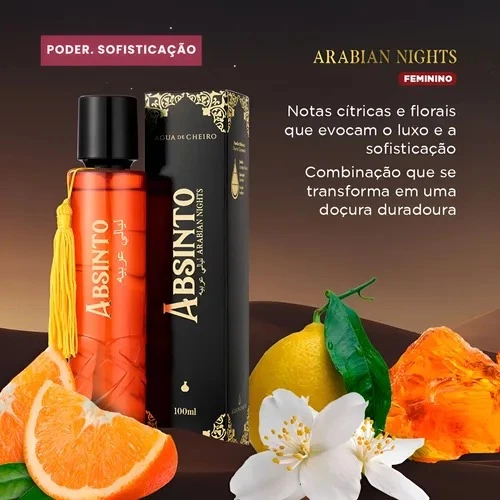A Deo Colônia Absinto Arabian Nights Feminina, é um convite para 1001 noites proibidas. Para uma mulher luxuosa, cheia de estilo, que chama muita atenção pelo seu poder e sua sofisticação. Um oriental glamuroso, que carrega laranja doce, jasmim e âmbar. A inspiração dos perfumes orientais vem não somente das especiarias, mas também da durabilidade. Para a criação desta fragrância, a ideia foi realçar o luxo e a sensualidade que transmite uma noite nas arábias, com uma saída cítrica que combina bergamota, limão siciliano e laranja doce, e notas de fundo açucaradas. Além de uma grande concentração de matérias primas no fundo, que tornam a fixação prolongada na pele. Família olfativa: Oriental Glamuroso Top: Laranja Doce Corpo: Jasmim Fundo: Âmbar O que são os perfumes árabes? •Inspirações olfativas que levam para o oriente, com ingredientes como frutas exóticas, incensos e especiarias quentes. •Overdose de ingredientes milenares com Âmbar, Açafrão, Rosas e Incenso. •São perfumes de alta fixação e projeção.