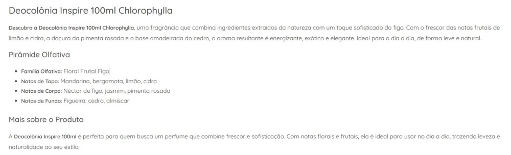 Descubra a Deocolônia Inspire 100ml Chlorophylla, uma fragrância que combina ingredientes extraídos da natureza com um toque sofisticado do figo. Com o frescor das notas frutais de limão e cidra, a doçura da pimenta rosada e a base amadeirada do cedro, o aroma resultante é energizante, exótico e elegante. Ideal para o dia a dia, de forma leve e natural.