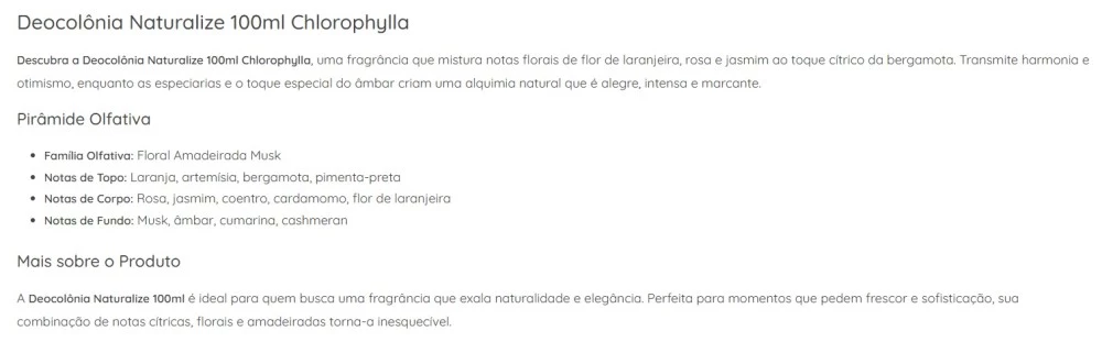 Descubra a Deocolônia Naturalize 100ml Chlorophylla, uma fragrância que mistura notas florais de flor de laranjeira, rosa e jasmim ao toque cítrico da bergamota. Transmite harmonia e otimismo, enquanto as especiarias e o toque especial do âmbar criam uma alquimia natural que é alegre, intensa e marcante.