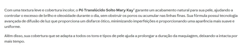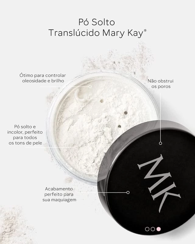 Com uma textura leve e cobertura incolor, o Pó Translúcido Solto Mary Kay® garante um acabamento natural para sua pele, ajudando a controlar o excesso de brilho e oleosidade durante o dia, sem obstruir os poros ou acumular nas linhas finas. Sua fórmula possui tecnologia avançada de difusão de luz que proporciona um disfarce ótico, minimizando imperfeições e proporcionando uma aparência mais suave e uniforme.
