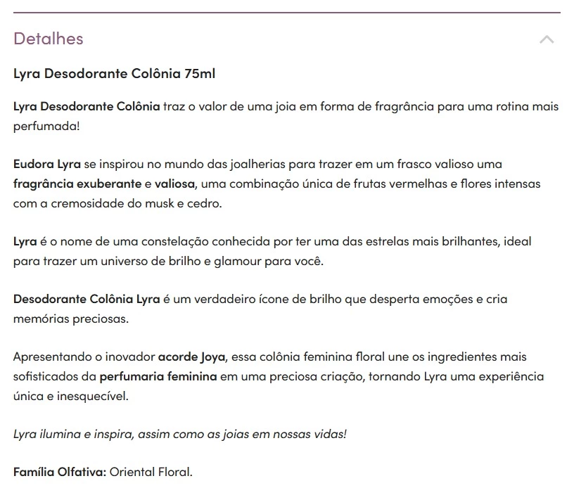 Eudora Lyra se inspirou no mundo das joalherias para trazer em um frasco valioso uma fragrância exuberante e valiosa, uma combinação única de frutas vermelhas e flores intensas com a cremosidade do musk e cedro.