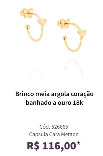 BRINCO MEIA ARGOLA CORAÇÃO BANHADO A OURO 18K - TAM.ÚNICO 526665 ROMMANEL