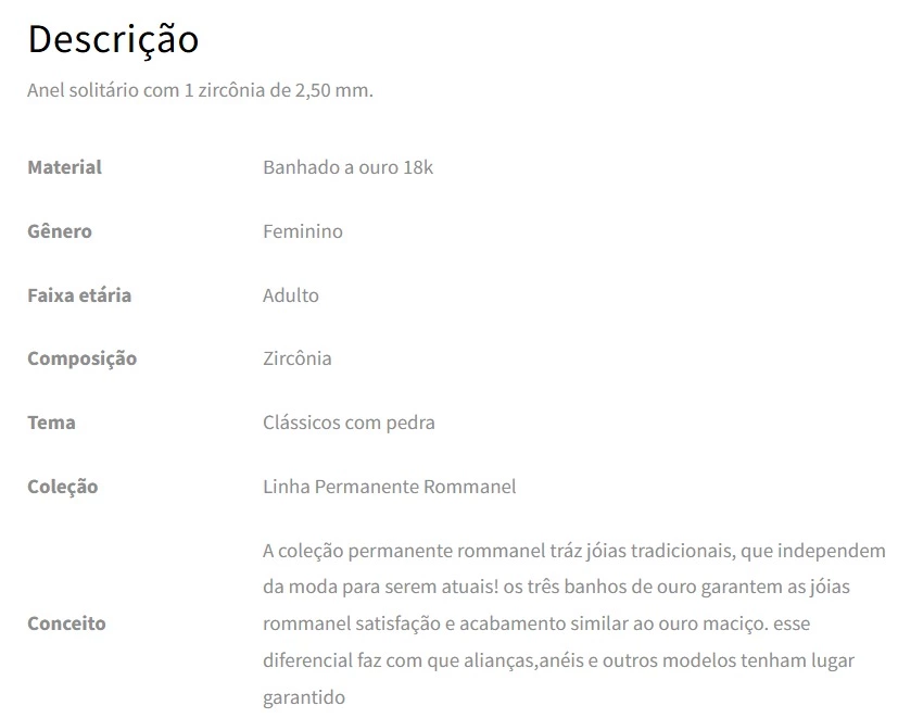 Conceito A COLEÇÃO PERMANENTE ROMMANEL TRÁZ JÓIAS TRADICIONAIS, QUE INDEPENDEM DA MODA PARA SEREM ATUAIS! OS TRÊS BANHOS DE OURO GARANTEM AS JÓIAS ROMMANEL SATISFAÇÃO E ACABAMENTO SIMILAR AO OURO MACIÇO. ESSE DIFERENCIAL FAZ COM QUE ALIANÇAS,ANÉIS E OUTROS MODELOS TENHAM LUGAR GARANTIDO