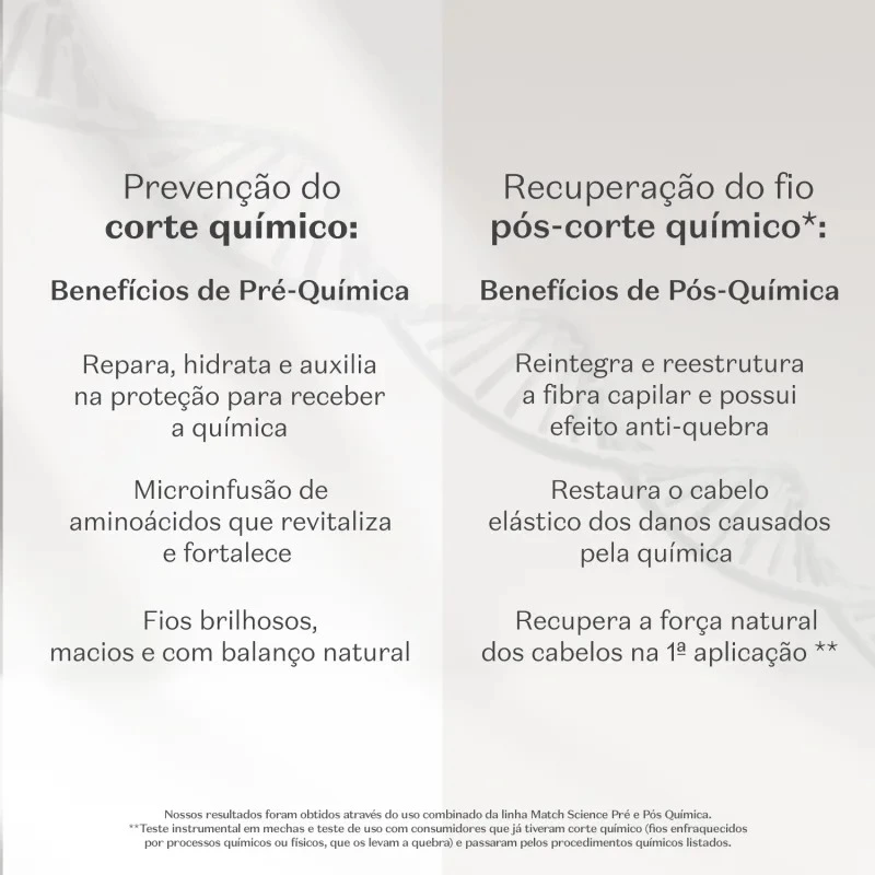 Ideal para recuperar o fio pós corte químico e fios enfraquecidos por química, Match Science Pré e Pós Química é uma linha de produtos para cabelos quimicamente tratados que auxilia na prevenção do corte químico e recupera a força natural dos fios na 1ª aplicação*. Com benefícios de Pré e Pós Química em uma única linha, traz ativos de alta performance e resultados comprovados cientificamente .
