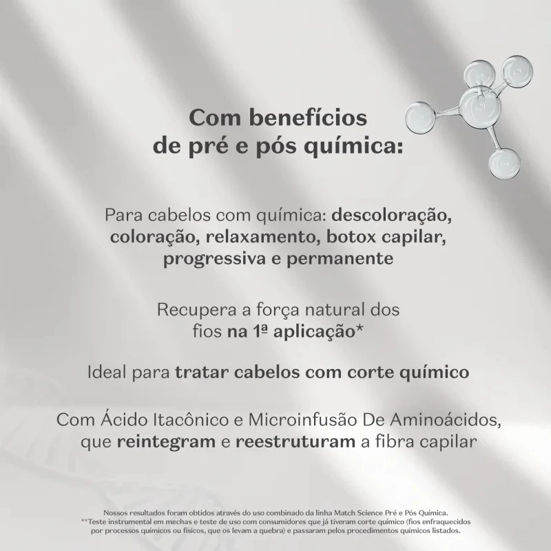 Ideal para recuperar o fio pós corte químico é fios enfraquecidos por química, Match Science Pré e Pós Química é uma linha de produtos para cabelos quimicamente tratados que auxilia na prevenção do corte químico e recupera a força natural dos fios na 1ª aplicação*. Com benefícios de Pré e Pós Química em uma única linha, traz ativos de alta performance e resultados comprovado cientificamente .