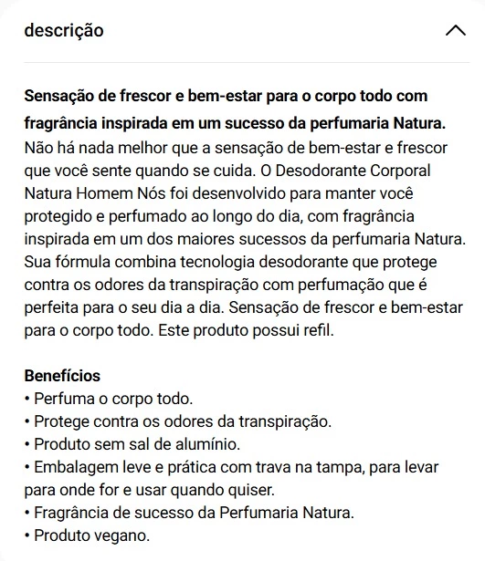 Não há nada melhor que a sensação de bem-estar e frescor que você sente quando se cuida. O Desodorante Corporal Natura Homem Nós foi desenvolvido para manter você protegido e perfumado ao longo do dia, com fragrância inspirada em um dos maiores sucessos da perfumaria Natura. Sua fórmula combina tecnologia desodorante que protege contra os odores da transpiração com perfumação que é perfeita para o seu dia a dia. Sensação de frescor e bem-estar para o corpo todo. Este produto possui refil.