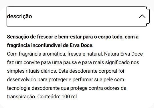 Com fragrância aromática, fresca e natural, Natura Erva Doce faz um convite para uma pausa e para mais significado nos simples rituais diários. Este desodorante corporal foi desenvolvido para proteger e perfumar sua pele com tecnologia desodorante que protege contra odores da transpiração. Conteúdo: 100 ml