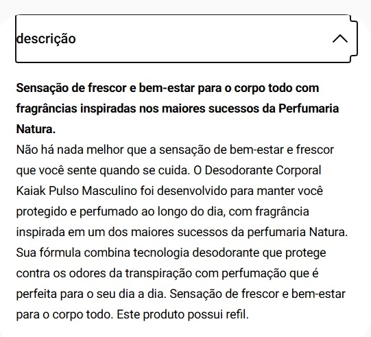 Não há nada melhor que a sensação de bem-estar e frescor que você sente quando se cuida. O Desodorante Corporal Kaiak Pulso Masculino foi desenvolvido para manter você protegido e perfumado ao longo do dia, com fragrância inspirada em um dos maiores sucessos da perfumaria Natura. Sua fórmula combina tecnologia desodorante que protege contra os odores da transpiração com perfumação que é perfeita para o seu dia a dia. Sensação de frescor e bem-estar para o corpo todo. Este produto possui refil.