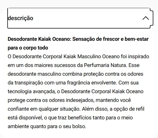 O Desodorante Corporal Kaiak Masculino Oceano foi inspirado em um dos maiores sucessos da Perfumaria Natura. Esse desodorante masculino combina proteção contra os odores da transpiração com uma fragrância envolvente. Com sua tecnologia avançada, o Desodorante Corporal Kaiak Oceano protege contra os odores indesejados, mantendo você confiante em qualquer situação. Além disso, a opção de refil está disponível, o que traz benefícios tanto para o meio ambiente quanto para o seu bolso.