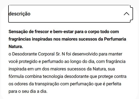 o Desodorante Corporal Sr. N foi desenvolvido para manter você protegido e perfumado ao longo do dia, com fragrância inspirada em um dos maiores sucessos da Natura, sua fórmula combina tecnologia desodorante que protege contra os odores da transpiração com perfumação que é perfeita para o seu dia a dia.
