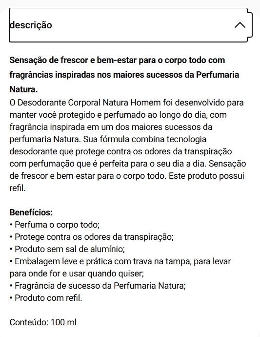 O Desodorante Corporal Natura Homem foi desenvolvido para manter você protegido e perfumado ao longo do dia, com fragrância inspirada em um dos maiores sucessos da perfumaria Natura. Sua fórmula combina tecnologia desodorante que protege contra os odores da transpiração com perfumação que é perfeita para o seu dia a dia. Sensação de frescor e bem-estar para o corpo todo. Este produto possui refil.