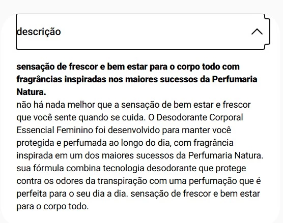 não há nada melhor que a sensação de bem estar e frescor que você sente quando se cuida. O Desodorante Corporal Essencial Feminino foi desenvolvido para manter você protegida e perfumada ao longo do dia, com fragrância inspirada em um dos maiores sucessos da Perfumaria Natura. sua fórmula combina tecnologia desodorante que protege contra os odores da transpiração com uma perfumação que é perfeita para o seu dia a dia. sensação de frescor e bem estar para o corpo todo.