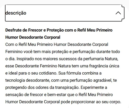 Com o Refil Meu Primeiro Humor Desodorante Corporal Feminino você tem mais proteção e perfumação durante todo o dia. Inspirado nos maiores sucessos da perfumaria Natura, esse Desodorante Feminino Natura tem uma fragrância única e ideal para o seu cotidiano. Sua fórmula combina a tecnologia desodorante, com uma perfumação agradável, te protegendo dos odores da transpiração. Experimente a sensação de frescor e bem-estar que o Refil Meu Primeiro Humor Desodorante Corporal pode proporcionar ao seu corpo.