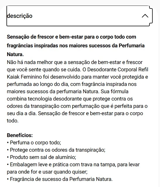 Não há nada melhor que a sensação de bem-estar e frescor que você sente quando se cuida. O Desodorante Corporal Refil Kaiak Feminino foi desenvolvido para manter você protegida e perfumada ao longo do dia, com fragrância inspirada nos maiores sucessos da perfumaria Natura. Sua fórmula combina tecnologia desodorante que protege contra os odores da transpiração com perfumação que é perfeita para o seu dia a dia. Sensação de frescor e bem-estar para o corpo todo.