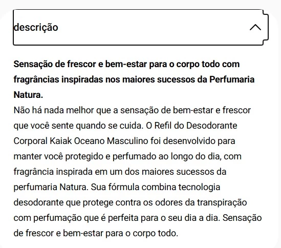 Não há nada melhor que a sensação de bem-estar e frescor que você sente quando se cuida. O Refil do Desodorante Corporal Kaiak Oceano Masculino foi desenvolvido para manter você protegido e perfumado ao longo do dia, com fragrância inspirada em um dos maiores sucessos da perfumaria Natura. Sua fórmula combina tecnologia desodorante que protege contra os odores da transpiração com perfumação que é perfeita para o seu dia a dia. Sensação de frescor e bem-estar para o corpo todo.