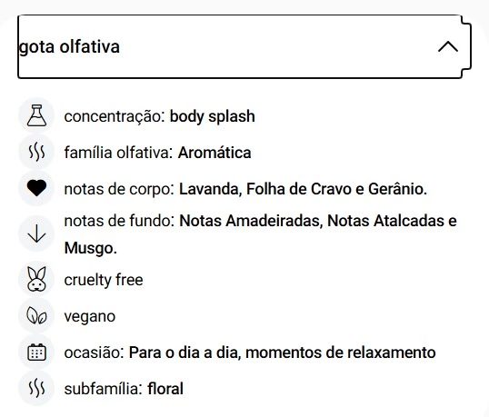 notas de corpo: Lavanda, Folha de Cravo e Gerânio.
