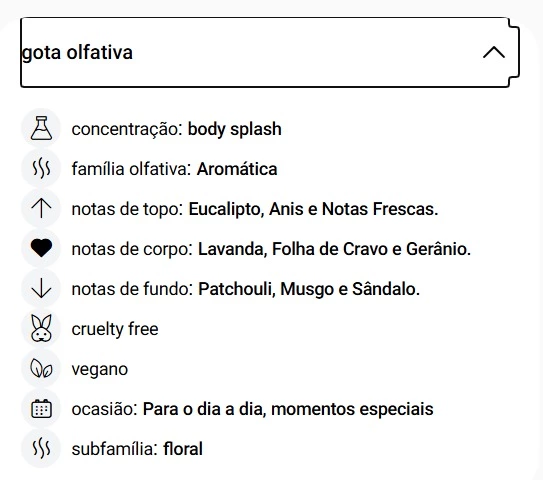 notas de corpo: Lavanda, Folha de Cravo e Gerânio.