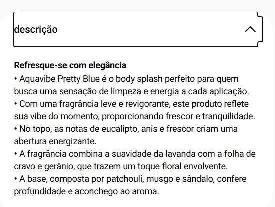 • Aquavibe Pretty Blue é o body splash perfeito para quem busca uma sensação de limpeza e energia a cada aplicação.