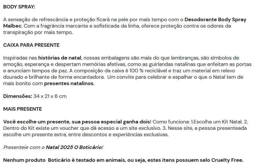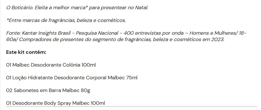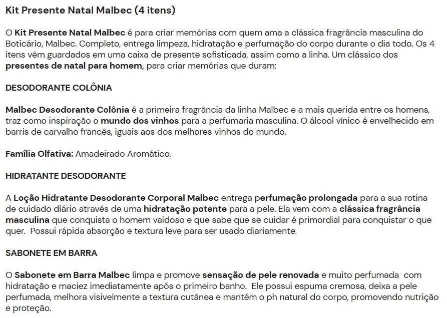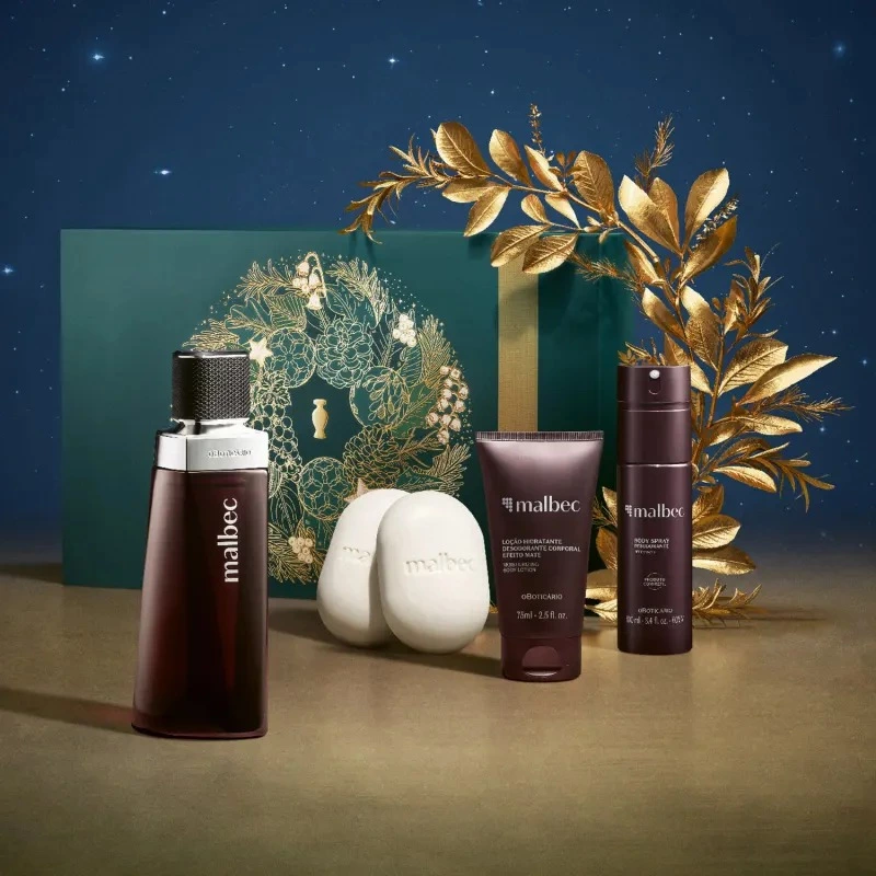 O Kit Presente Natal Malbec é para criar memórias com quem ama a clássica fragrância masculina do Boticário, Malbec. Completo, entrega limpeza, hidratação e perfumação do corpo durante o dia todo. Os 4 itens vêm guardados em uma caixa de presente sofisticada, assim como a linha. Um clássico dos presentes de natal para homem, para criar memórias que duram: