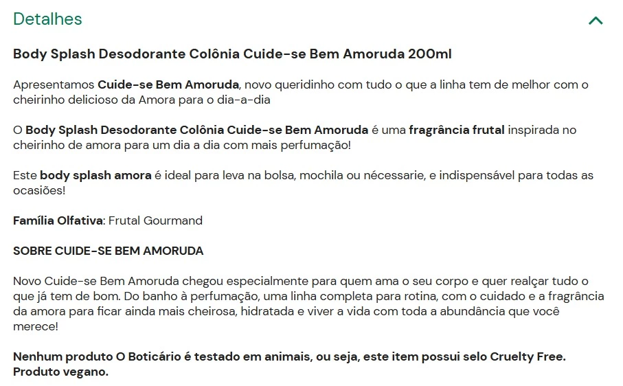 Nenhum produto O Boticário é testado em animais, ou seja, este item possui selo Cruelty Free. Produto vegano.