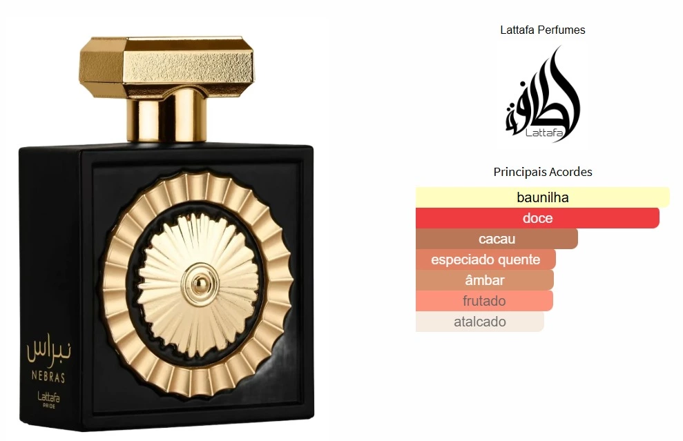 Ocasião: Adequado para todas as ocasiões, desde uso diário até eventos especiais. Embalagem: O Lattafa Nebras Eau de Parfum vem em uma embalagem elegante e sofisticada, refletindo a qualidade e o luxo do produto. O frasco é cuidadosamente desenhado para ser um complemento estético ao seu tocador. Uso Recomendado: Aplicação: Aplique nos pontos de pulso, como pulsos, pescoço e atrás das orelhas, para maximizar a projeção e a longevidade da fragrância. Sugestão: Ideal para uso durante o dia e a noite, em qualquer estação do ano. Marca: Lattafa é uma marca renomada no mundo das fragrâncias, conhecida por seus perfumes de alta qualidade e pelas combinações únicas de ingredientes. Eles são apreciados por oferecer uma excelente relação custo-benefício, combinando luxo e acessibilidade.