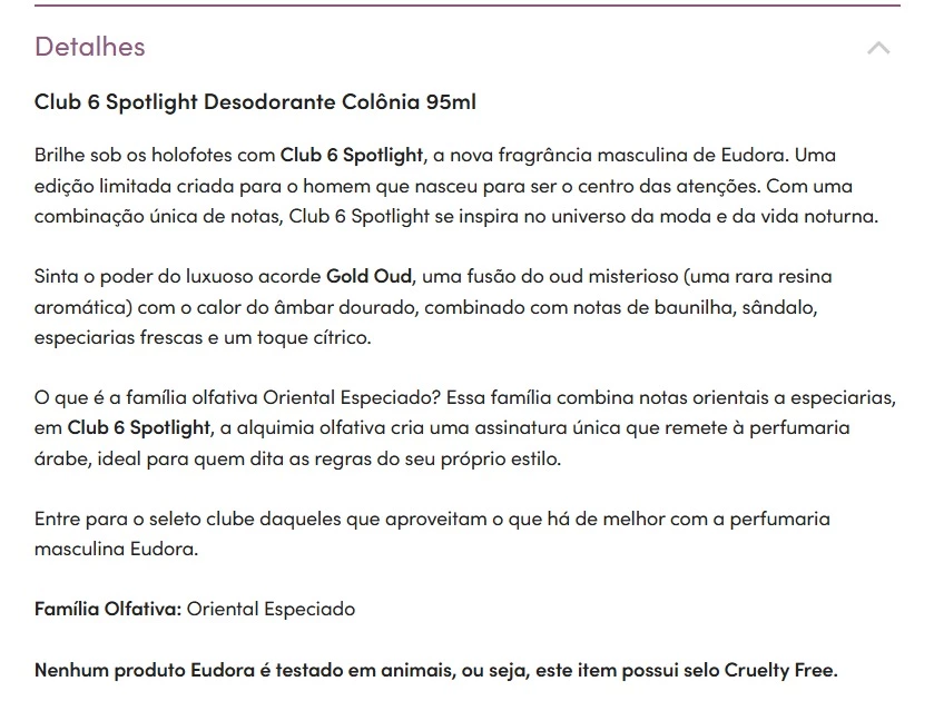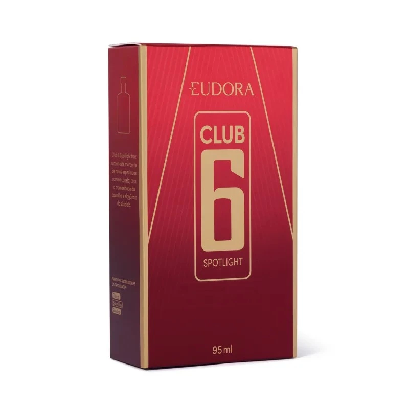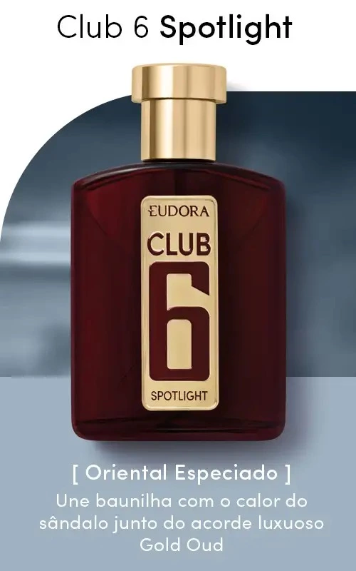 Brilhe sob os holofotes com Club 6 Spotlight, a nova fragrância masculina de Eudora. Uma edição limitada criada para o homem que nasceu para ser o centro das atenções. Com uma combinação única de notas, Club 6 Spotlight se inspira no universo da moda e da vida noturna.