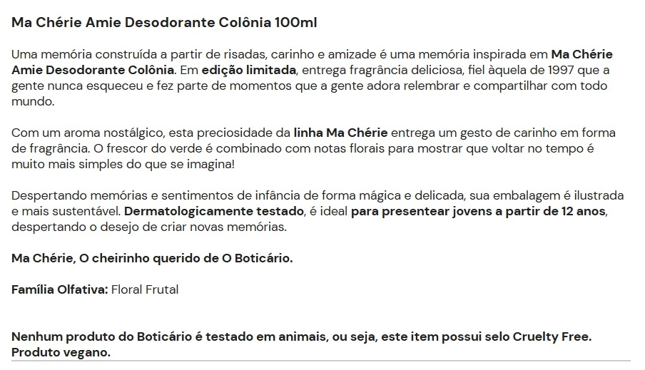 Uma memória construída a partir de risadas, carinho e amizade é uma memória inspirada em Ma Chérie Amie Desodorante Colônia. Em edição limitada, entrega fragrância deliciosa, fiel àquela de 1997 que a gente nunca esqueceu e fez parte de momentos que a gente adora relembrar e compartilhar com todo mundo.